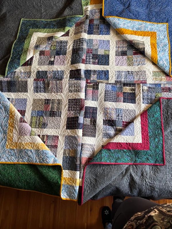These four quilts were made for four sisters who lost their father. Each quilt has the same design and their dad's shirts but different complementary colours were used for each of the girls to make the quilts truly theirs.